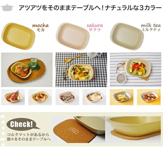 魚焼きグリル、オーブントースター、オーブン、電子レンジOK ■アツアツをそのままテーブルへ!ナチュラルな3カラー コルクマットがあるから熱々をそのままテーブルへ。