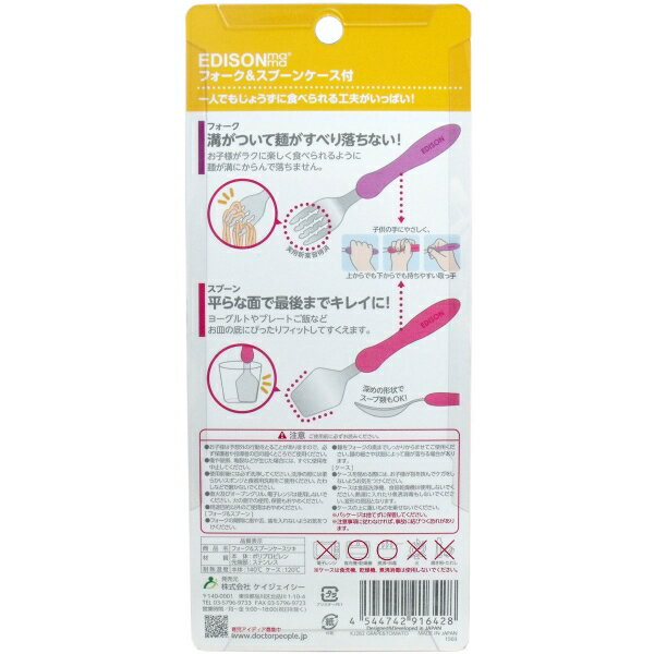 エジソンママ フォーク&スプーン (ケース付き) オレンジ&ソーダ色エジソンママ フォーク&スプーンBaby さくら色エジソンママ フォーク&スプーンBaby わかば色エジソンママ もぐもぐトレイ さくら色エジソンママ あつまるボウル そら色エジソンママ ぱくぱくプレート わかば色【エジソンママ フォーク&スプーン (ケース付き) グレープ&トマト色】広告文責(有)イースクエアTEL:0120-532-772株式会社ケイジェイシー個装サイズ:101X231X25mm個装重量:約110g内容量:1セット入製造国:日本【発売元:ケイジェイシー】【セット内容】フォーク・・・1スプーン・・・1ケース・・・1【材質】本体・・・ポリプロピレン先端部・・・ステンレス【耐熱温度】本体・・・140度ケース・・・120度【対象年齢】1.5歳〜【注意】・お子様は予想外の行動をとることがありますので、必ず保護者や指導者の監督下でご使用ください。